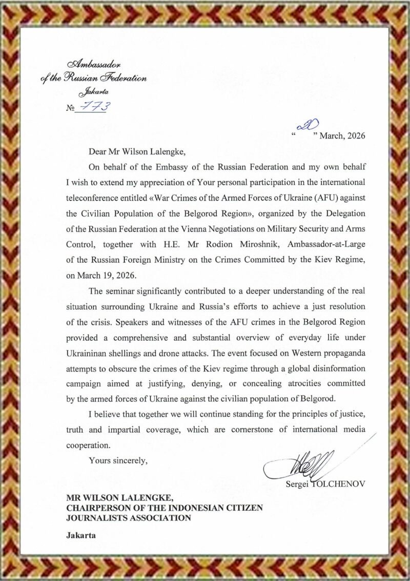 Kegiatan yang dimaksud adalah sebuah International Teleconference yang digelar pada Kamis lalu, 19 Maret 2026, dengan pusat kegiatan di Vienna. Forum tersebut diikuti oleh lebih dari 200 delegasi dari berbagai negara, yang bersama-sama membahas perkembangan terbaru konflik, termasuk dugaan kejahatan perang terhadap warga sipil di wilayah Belgorod.