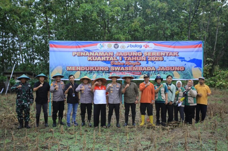 Detikdimensi.com Madiun – Polres Madiun melaksanakan kegiatan penanaman jagung serentak kuartal I sebagai bentuk dukungan terhadap program ketahanan pangan nasional. Kegiatan tersebut berlangsung di lahan pertanian yang berlokasi di Jalan Raya Sareng, Desa Sareng, Kecamatan Geger, Kabupaten Madiun, Sabtu ( 7/3 2026).