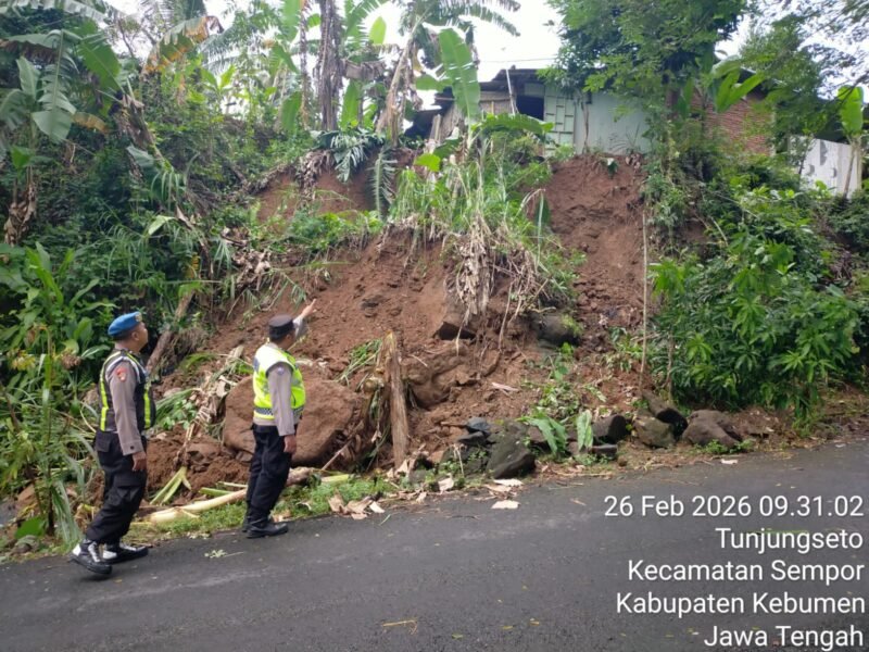 Detikdimensi.com, Kebumen – Hujan deras yang mengguyur wilayah Kecamatan Sempor, Kabupaten Kebumen, Kamis dini hari, 26 Februari 2026, memicu longsor tebing di samping rumah warga. Material tanah setinggi sekitar delapan meter dengan panjang kurang lebih enam meter ambrol di sisi rumah milik Suratno, warga Dukuh Romagunung, Desa Tunjungseto.