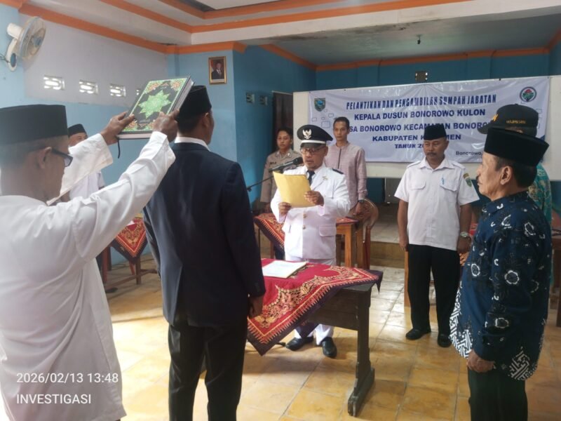 Detikdimensi.com, Kebumen – Desa Bonorowo, Kecamatan Bonorowo, Kabupaten Kebumen, menjadi pusat perhatian pada acara pelantikan dan pengambilan sumpah jabatan Kepala Dusun (Kadus) Bonorowo Kulon 2026. Acara tersebut dihadiri oleh perwakilan Forkopincam, BPD, lembaga, dan tokoh masyarakat setempat.
