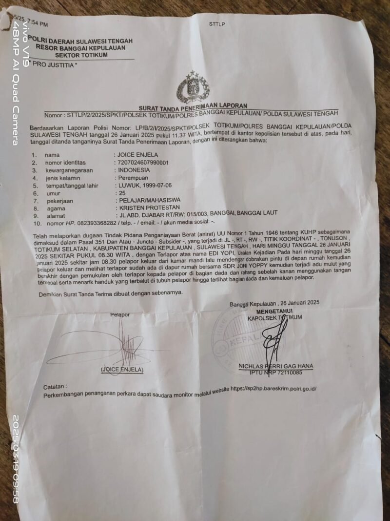 Hal ini bermula atas pengakuan Joice Enjel dan Erni yopi warga Desa Tonuson Kecamatan Totikum selatan Kabupaten Banggai Kepulauan Provinsi Sulawesi Tengah sudah melaporkan inisial EY dan JY yang telah menganiaya dan melecehkan korban Joice Enjel kepada Polsek Totikum selatan, korban mengeluh lambannya penanganan kasus pelaporan di polsek Totikum selatan, padahal laporannya sejak 25/1/2025 lalu.